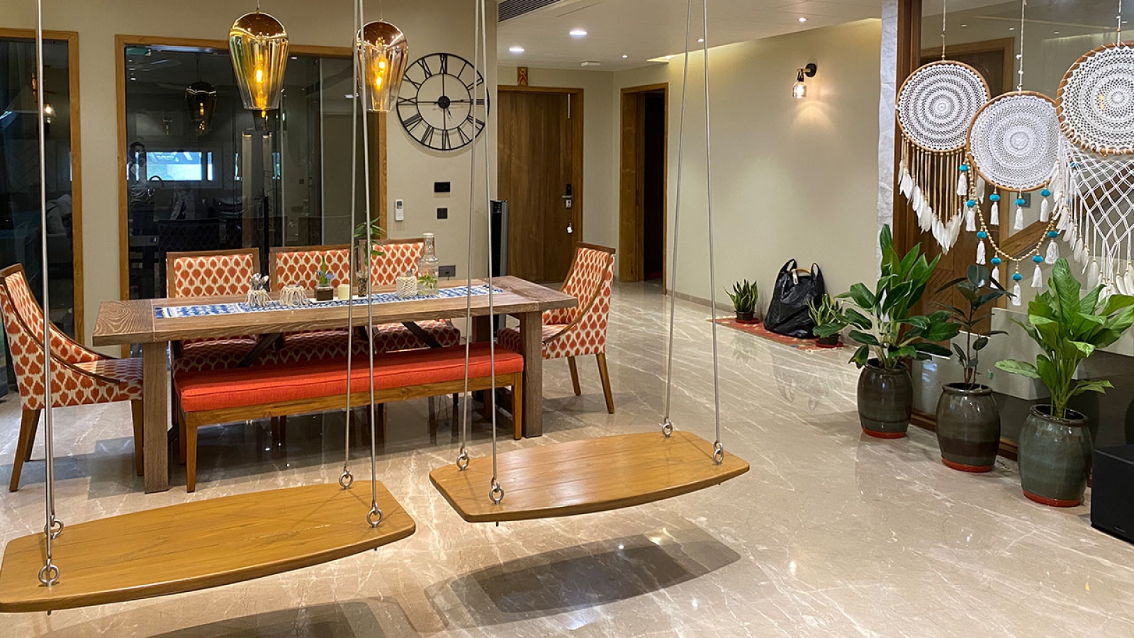 The house host Ahmedabad city’s one of the renowned corporate lawyers Mr. R.C.Gandhi and his family. It accommodates a family of 6 members. As the client is a renowned person, large living spaces are required for gathering. For most gatherings, the terrace is all equipped with music and light, low height, and a cozy setting to enjoy a beautiful evening and have a memorable time. The theme chosen is modern and contemporary, as per the client’s requirement. The entrance is a double-height space for its grand appeal and aesthetic touch.