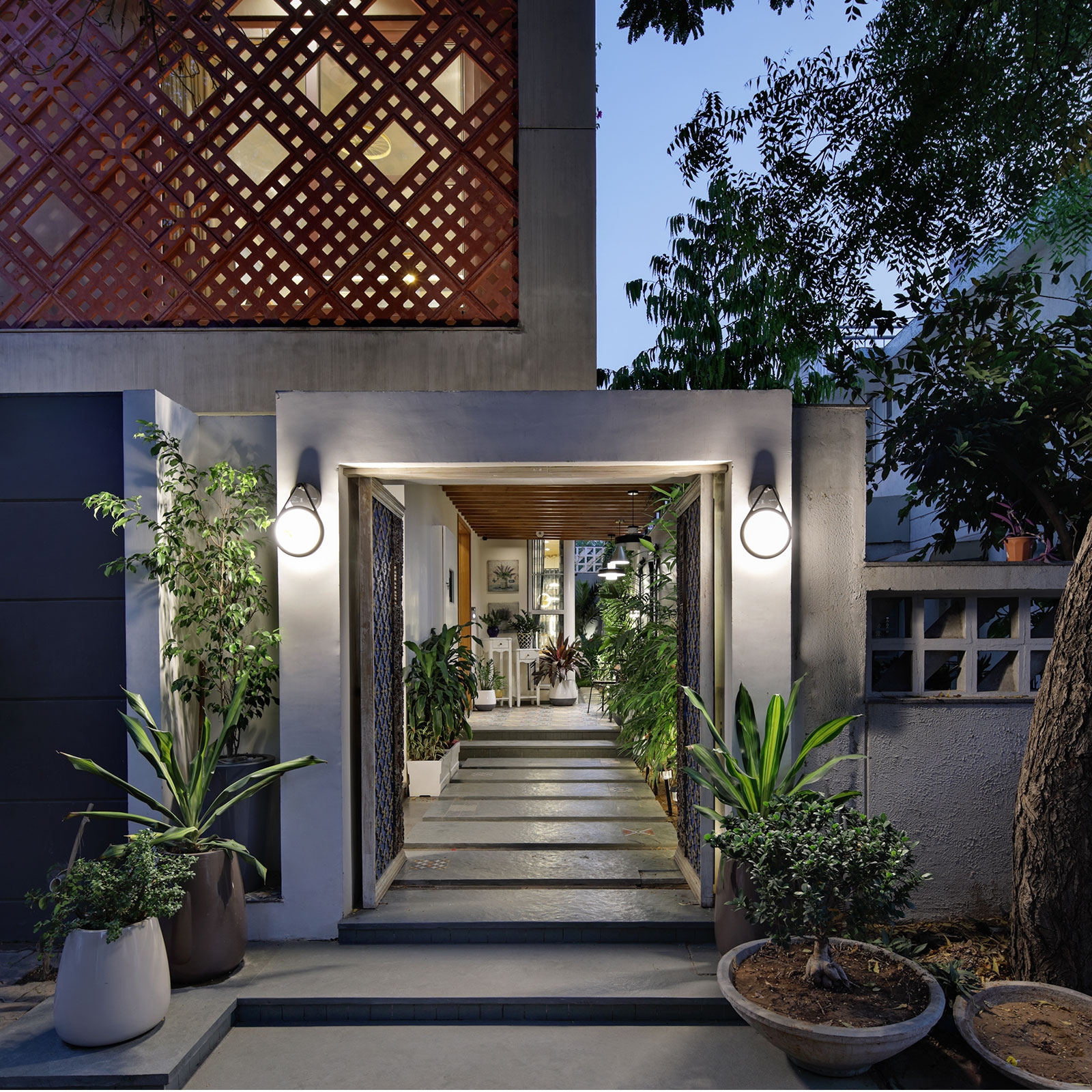 The Eclectic House at Vasuma Hills, Ahmedabad replicates interiors centred on relaxing colours, harmonious furniture arrangement and simple planning The design of the house is responding to the green in such a way that the entire house structure is gelling with greenery. A simple design of the façade is highlighted with GRC jali & metal CNC cut railing which is making it a unique composition of art.