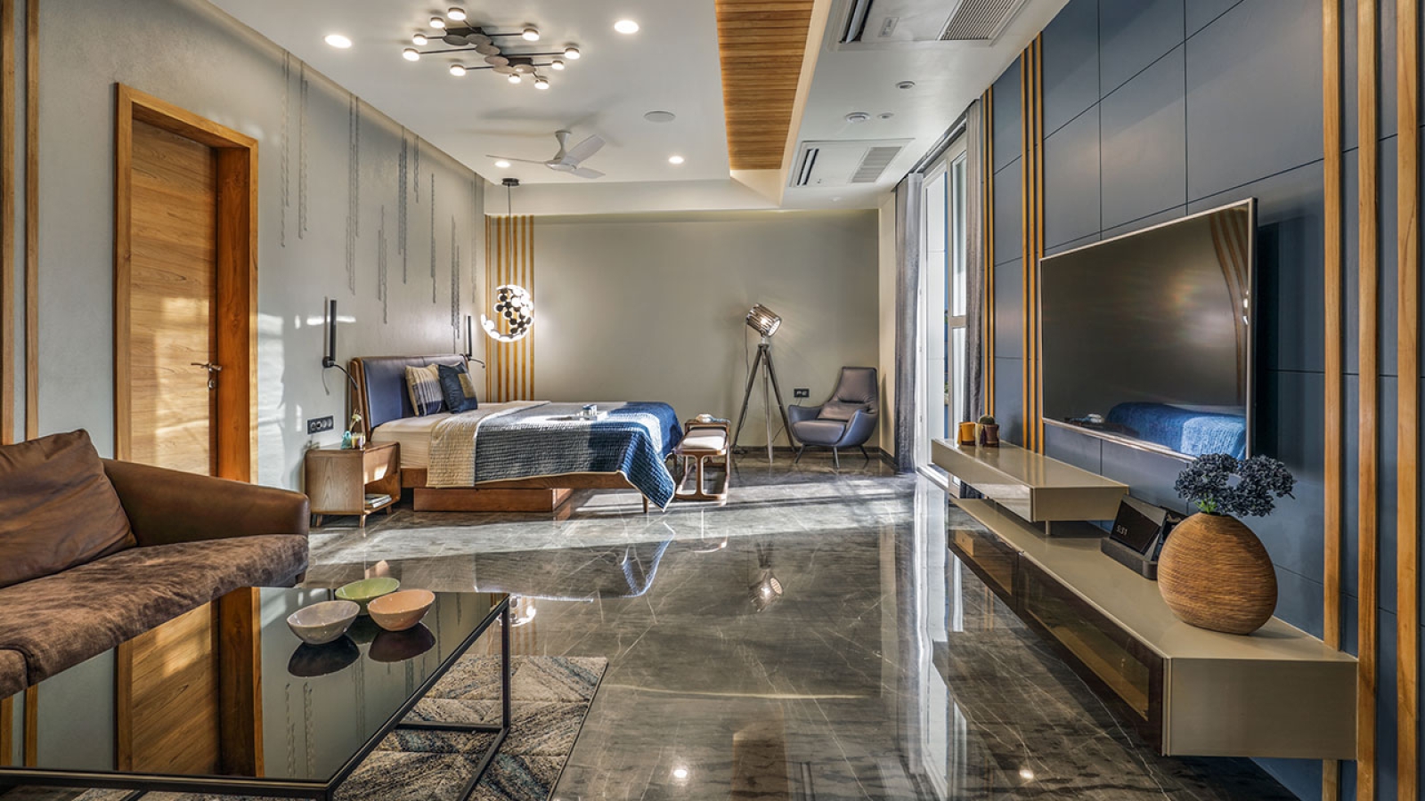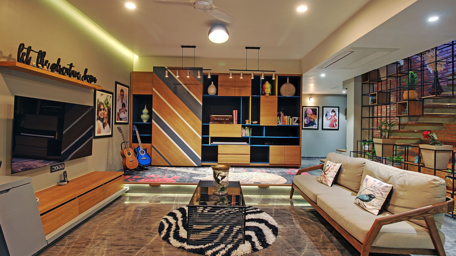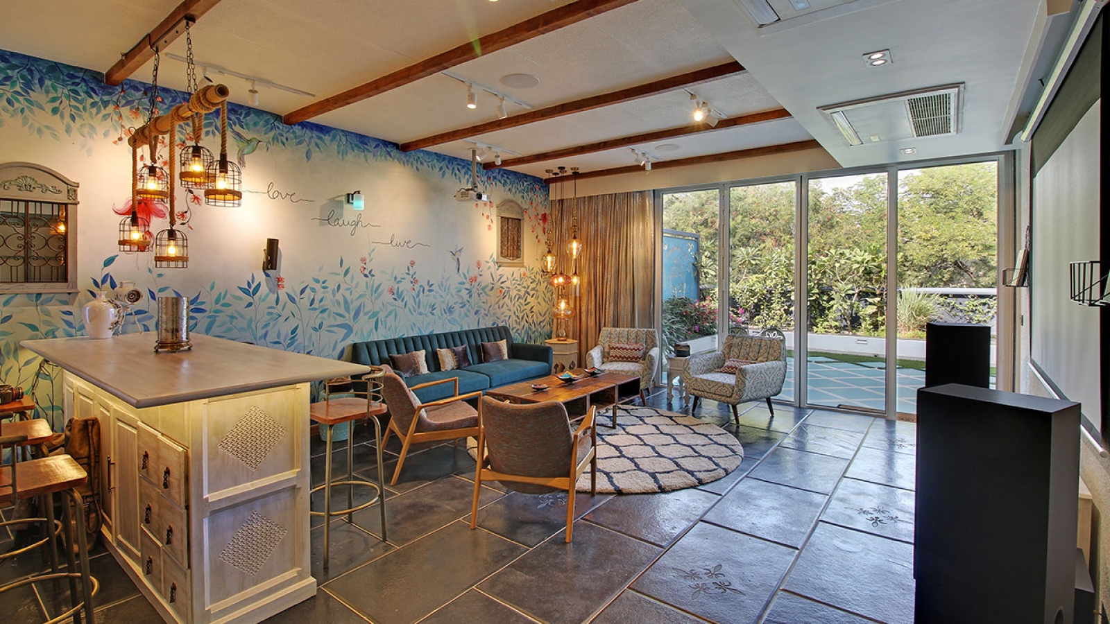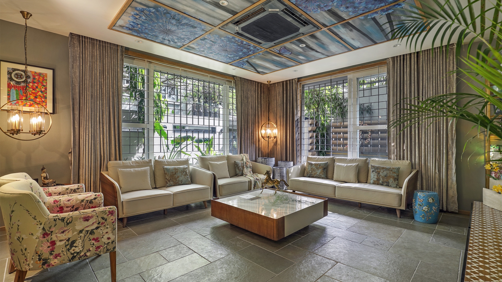 This distinctive modern project has a harmony of experiences from the eye-catching vintage look to flora inspired imprints on R.C.C. exposed ceiling with elements used are itemized by implementing minute detailing which cast amazing shadows on the surroundings when hung on the ceiling. It creates a mystical and exotic atmosphere, yet the elegant Moroccan décor pieces look nice and cosy and as a result, it makes the home warmer and inviting.
